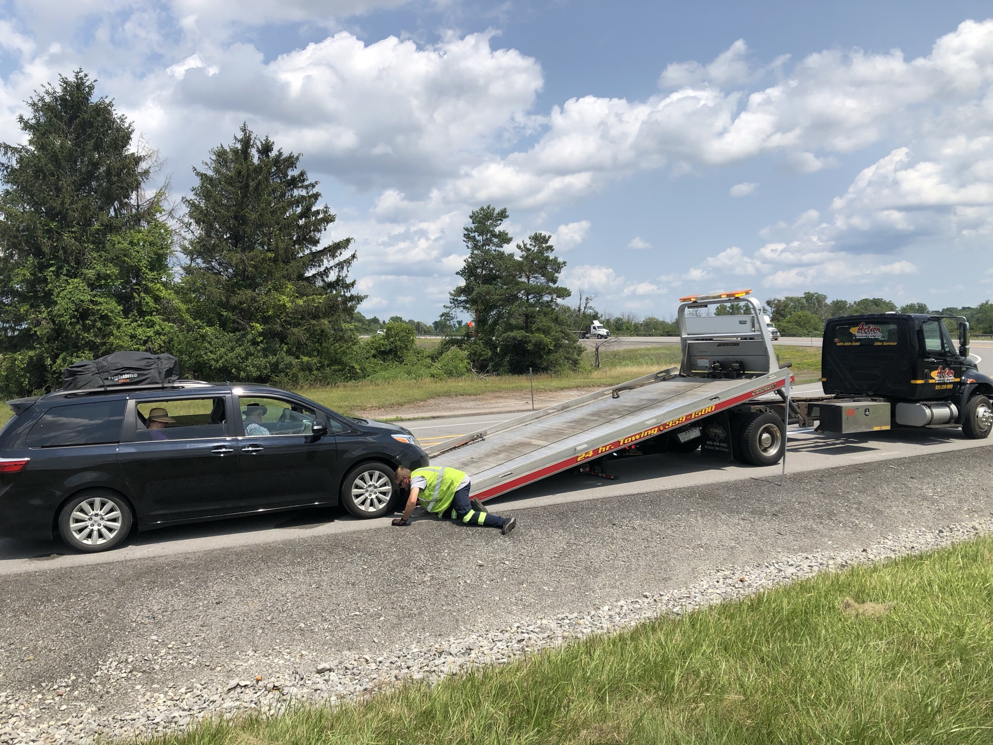 After a flurry of phone calls to AAA and various tire shops, we finally found a dealership with tires that matched. Before too long, the tow truck arrived. NomiAnn and Papa Kay got to travel in style.