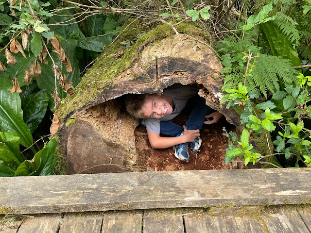 Before lunch we decided to go for a mini-hike along the Rockaway Big Tree Trail. Only half a mile inland, it's amazing how you escape the fog by moving in from the shore. Eli liked this rotting tree.