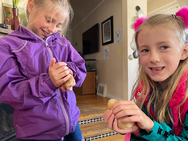 It occurs to me that you have discovered how to enjoy baby chicks, without regretting their existence when they grow older, messier and meaner. Good for all of you!