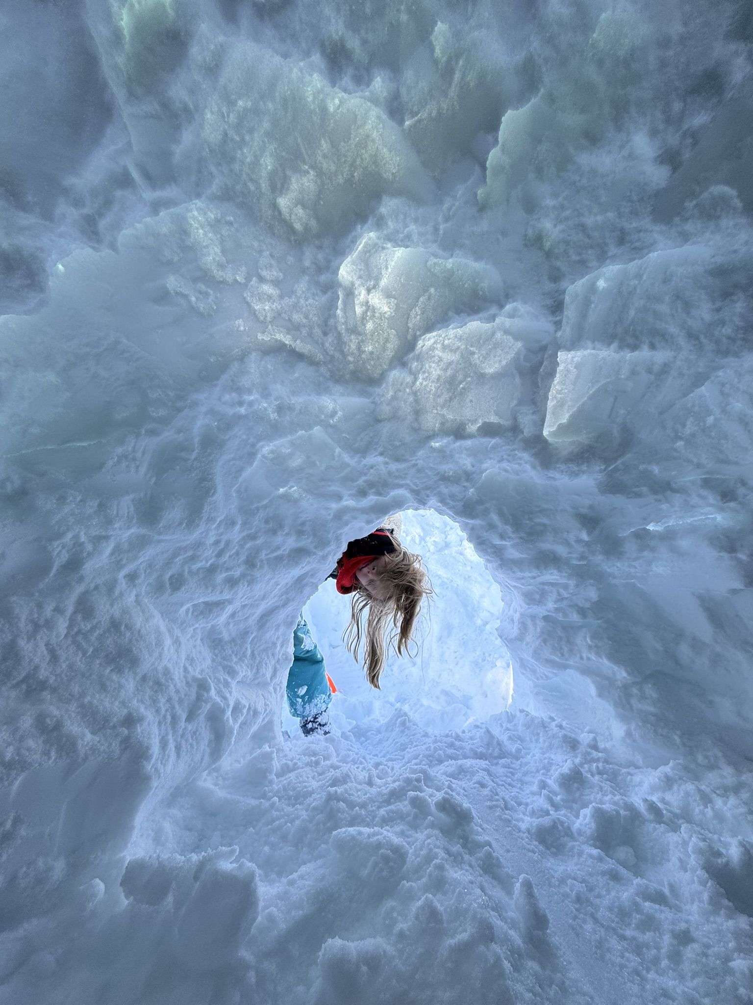 Quinzhee concept and building / demolition stages are ideal for youthful adventurers. Fun, fun, and more fun. I hope Talia's frozen tongue has defrosted. Smile.